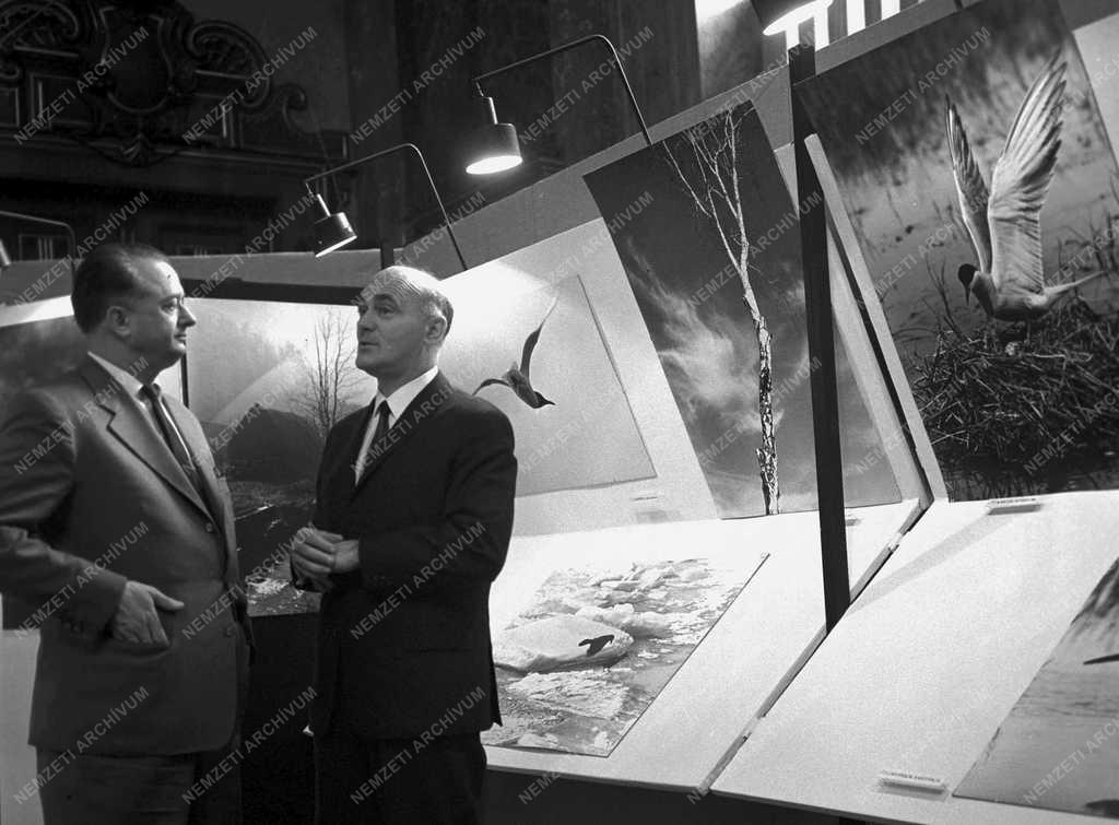 Ortutay Gyula, a Magyar Tudományos Akadémia tagja és Barcs Sándor, a Magyar Távirati Iroda vezérigazgatója beszélgetnek, amikor a Magyar Fotóművészek Szövetsége és a Nemzeti Galéria rendezésében, Tildy Zoltán madárfotóiból kiállítás nyílt, a Nemzeti Galéria dísztermében.