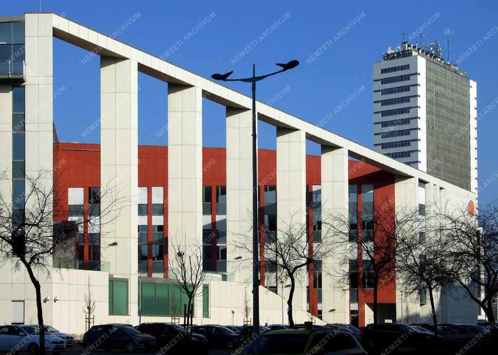 A Nemzeti Közszolgálati Egyetem új oktatási épülete (j) a főváros VIII. kerületében, az Üllői út mentén. Épült 2018-ban a Finta-stúdió tervei alapján. Távolabb (j) a Semmelweis Egyetem toronyépülete a Nagyvárad téren.