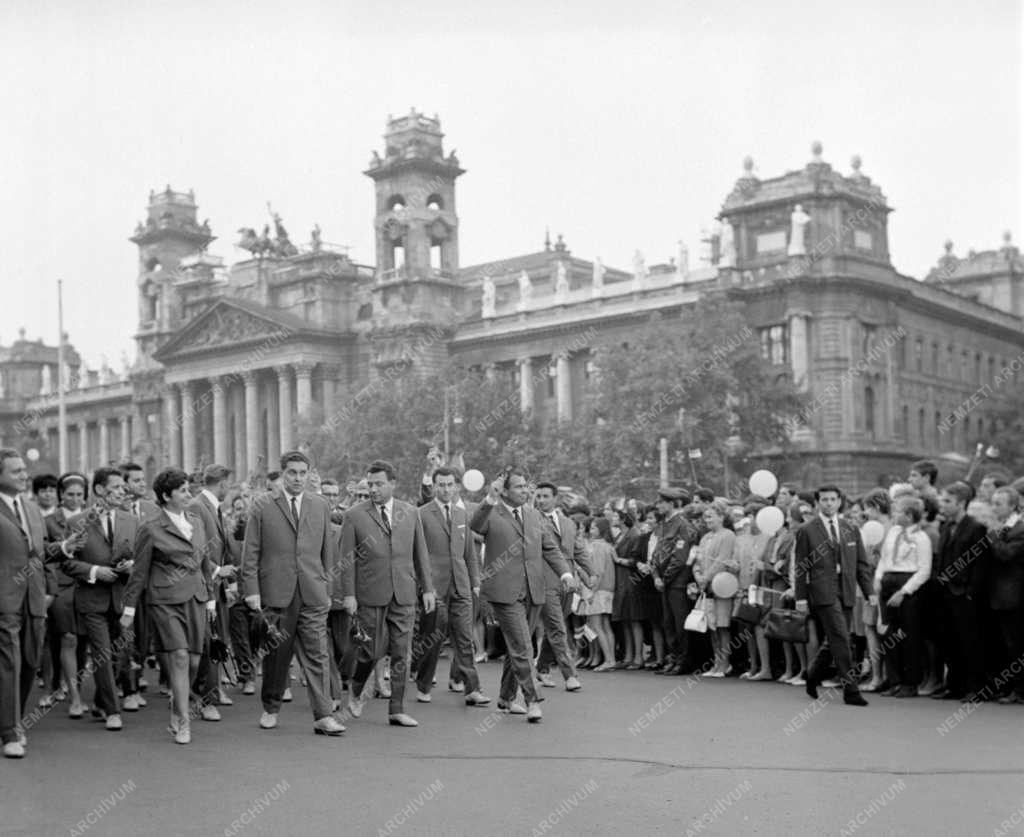 A VIT-re (Világifjúsági Találkozó) induló magyar delegáció tagjai integetnek a tiszteletükre rendezett ifjúsági nagygyűlés résztvevőinek. Háttérben a Magyar Nemzeti Galéria épülete.
