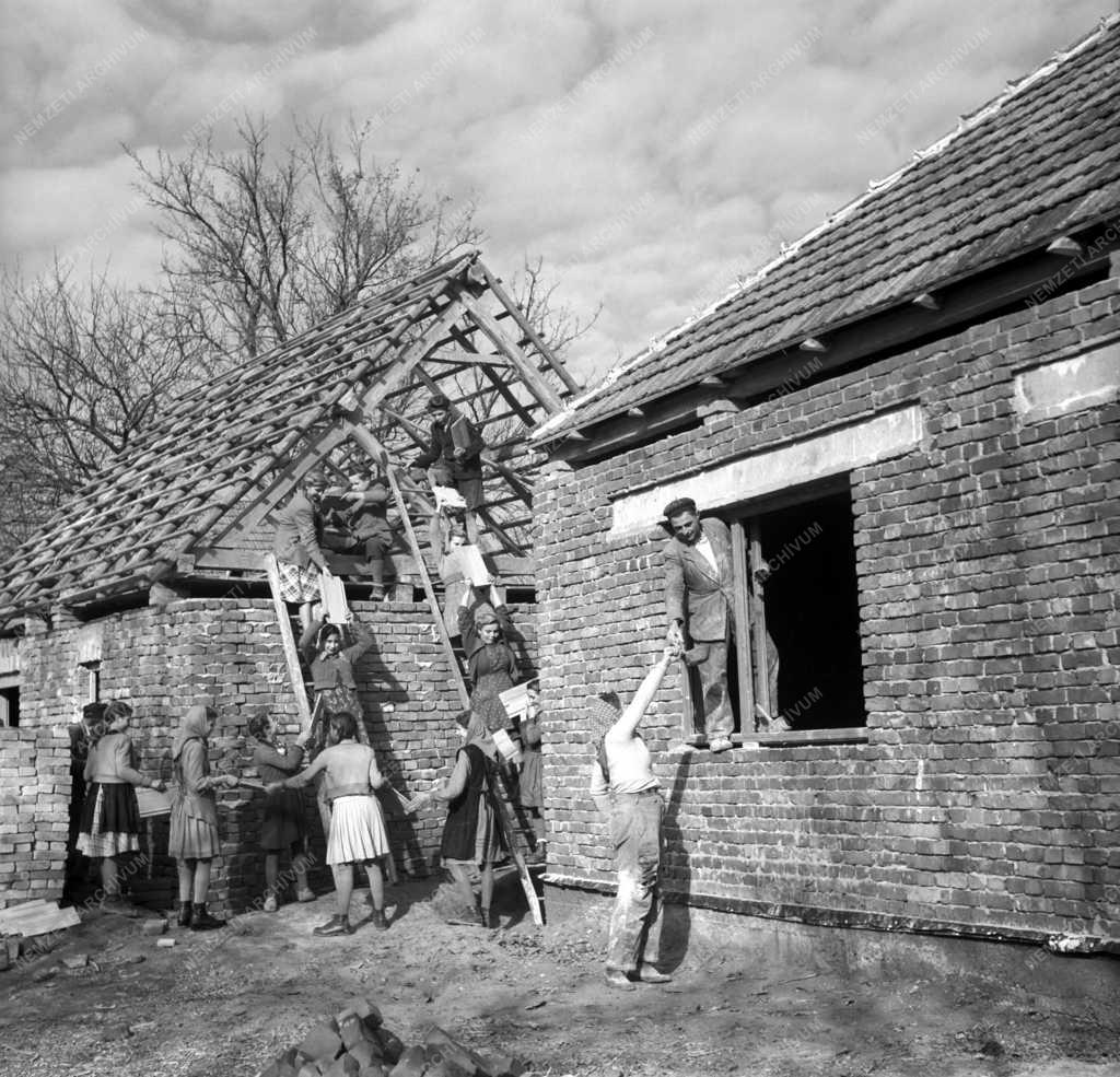 A bodaki iskolások adogatják a tetőcserepeket az egyik ház építésénél az árvíz után.