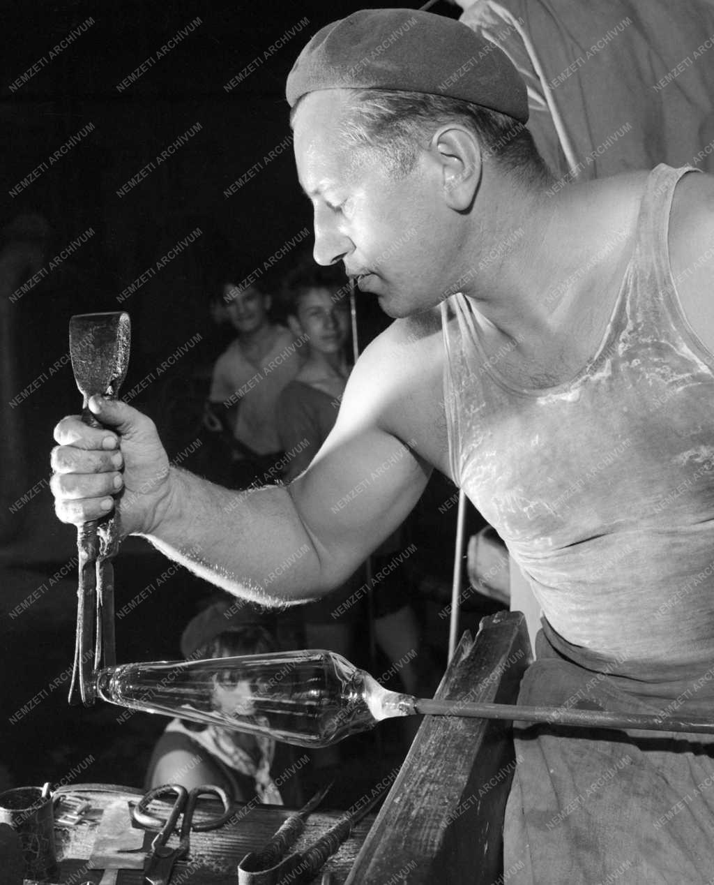Bőhm Pál egy üvegtárgyat formáz az Ajkai Üveggyárban, ahol naponta ezerszámra készülnek a vizeskancsók, talpas poharak, üveglopók és más, közhasználatú üvegtárgyak. A gyártmányokból a igények mellett jelentős mennyiségben exportra is jut.