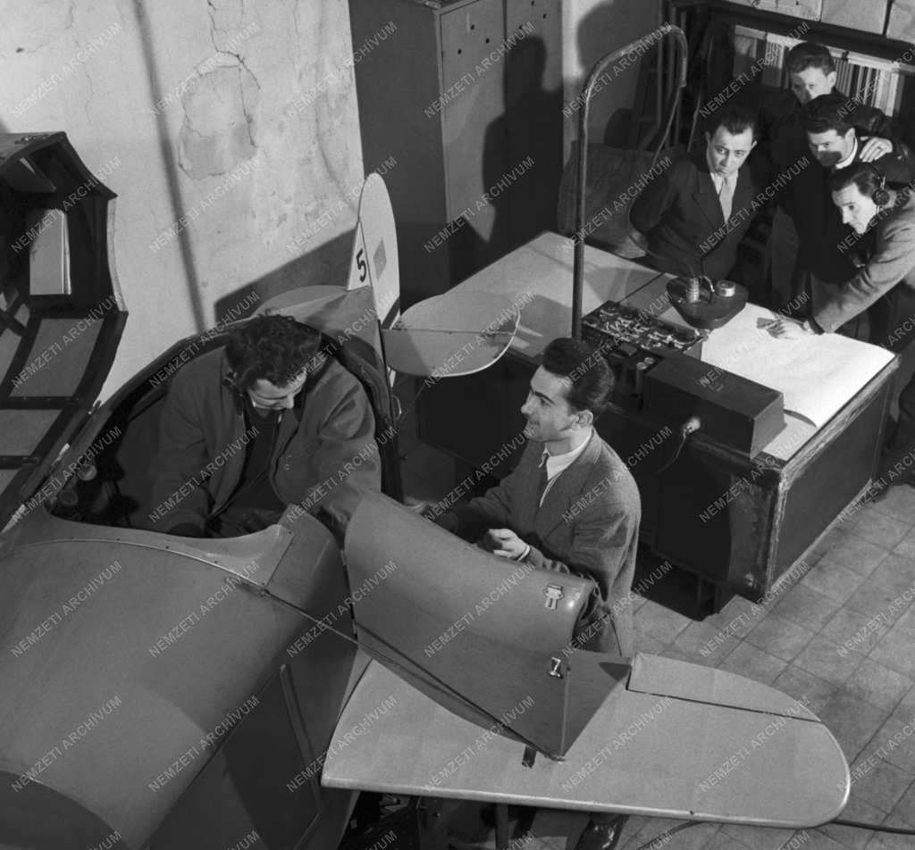 Az Ipari Tanulók Repülő Klubjának tagjai ellenőrzik az MHS Központi Repülő Klub megjavított vakrepülő berendezését, a Link Trainer működését. A szimulátort társadalmi munkában tették újra használhatóvá, ezzel az oktatás újra sokkal olcsóbb és veszélytelenebb lesz.