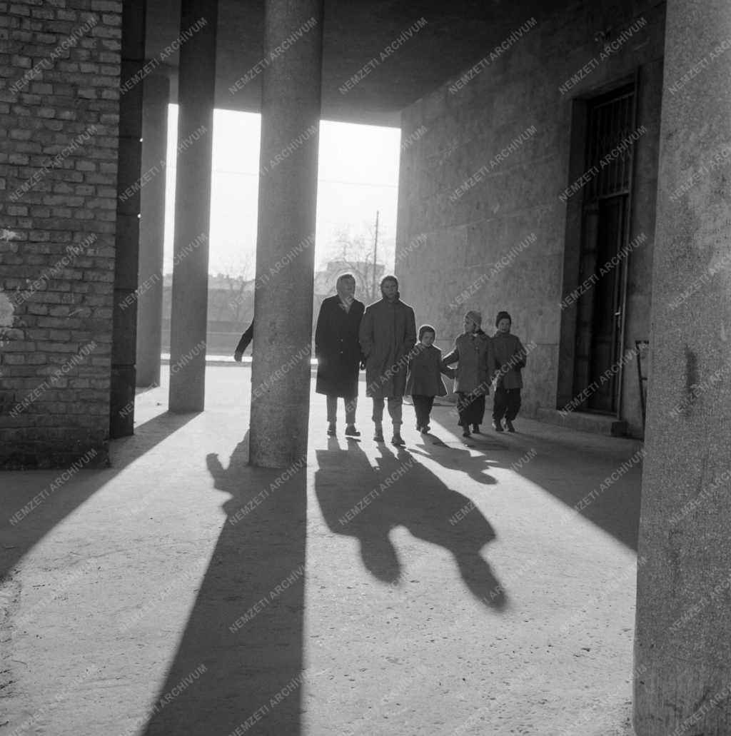 Járókelők, gyerekek mennek a Somfa köz és a Száva utca közötti 1955-ben Zöldy Emil tervei alapján épült Üllői úti lakótelep (Szárnyas utcai lakótelep) egyik házának árkádja alatt.