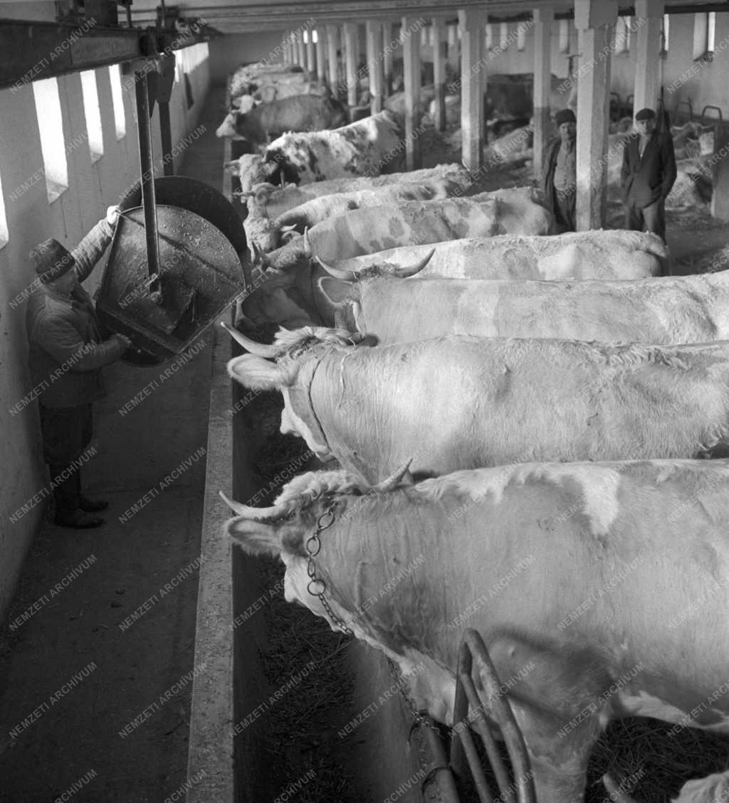 A szarvasmarhákat eteti egy gazda a kétsopronyi Dózsa Termelőszövetkezet istállójában.