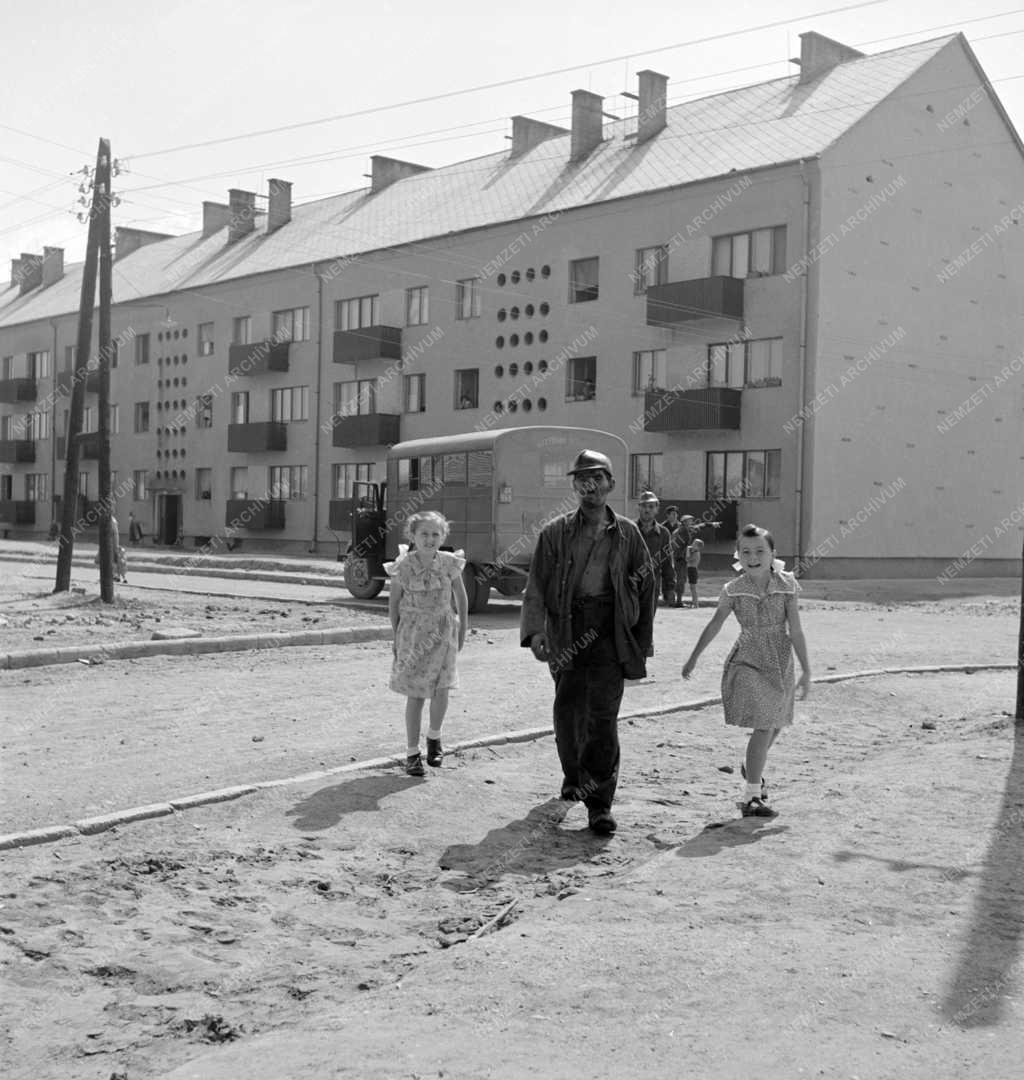 Egy hazatérő bányász két kislány társaságában az új oroszlányi bányászlakótelepen.