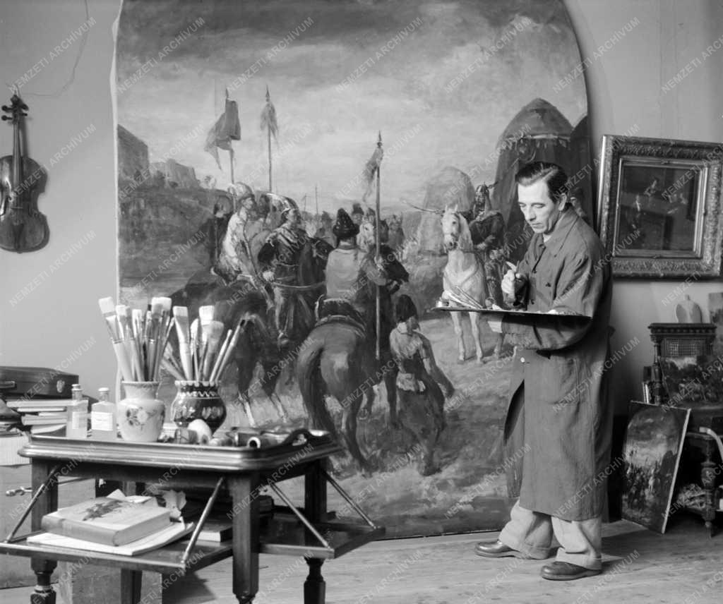 P. Bak János festőművész a jászberényi kultúrháznak készülő festményén dolgozik, a szolnoki művésztelepen lévő műtermében.