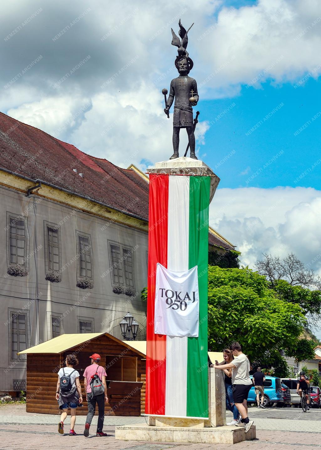 Kirándulók a Kossuth téren, a Szent István-szobor Péterfy László alkotása (2000), az észak-magyarországi, a Tisza és a Bodrog folyók találkozásánál, a Kopasz-hegy lábánál fekvő településen, amely 950 éves évfordulóját ünnepli. Tokajt, mint a környék nevét először 1067-ben említi ismert, írott forrás, ekkor már szőlőtermesztő vidék volt. Majd (talán) 1074-ben említik, amidőn Salamon király a kemeji csata után Cothoydnál menekült át a Tiszán, amely nevet sok történetíró Tokajnak véli. Magát a települést 1353-ban említik először Tokaj néven.