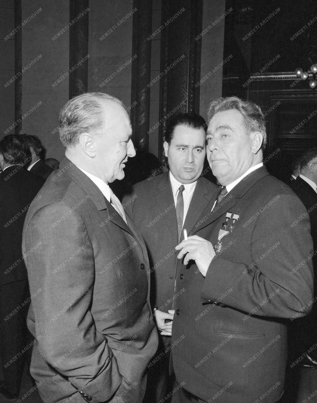 Kádár János, a Magyar Szocialista Munkáspárt Központi Bizottságának első titkára beszélget a Parlament folyosóján Leonyid Iljics Brezsnyevet, a Szovjetunió Kommunista Pártjának főtitkárát.