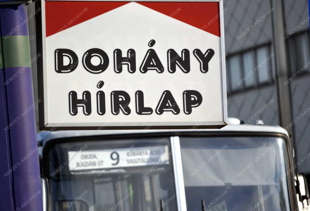 Dohány és hírlap reklámtábla a Liget téren, Kőbányán.
