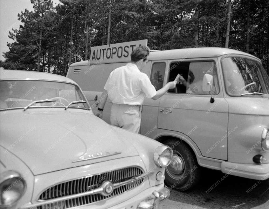 Levelét elküldeni szándékozó az országút mentén állítja meg a Magyar Posta új egy kelet-német gyártmányú Barkas B1000 típusú kis-teherjárművében működő mozgó postahivatalát. Az úgynevezett autóposta, a balatoni campingezők eddigi levelezési gondjain segít. A jármű minden nap meglátogatja a lakott területektől távol eső sátortáborokat és gondoskodik arról, hogy a nyaralók üdvözlőlapja késedelem nélkül eljuthassanak a címzettekhez. Az autóposta magyar és külföldi kiadású újságokat és képeslapokat is árusít.