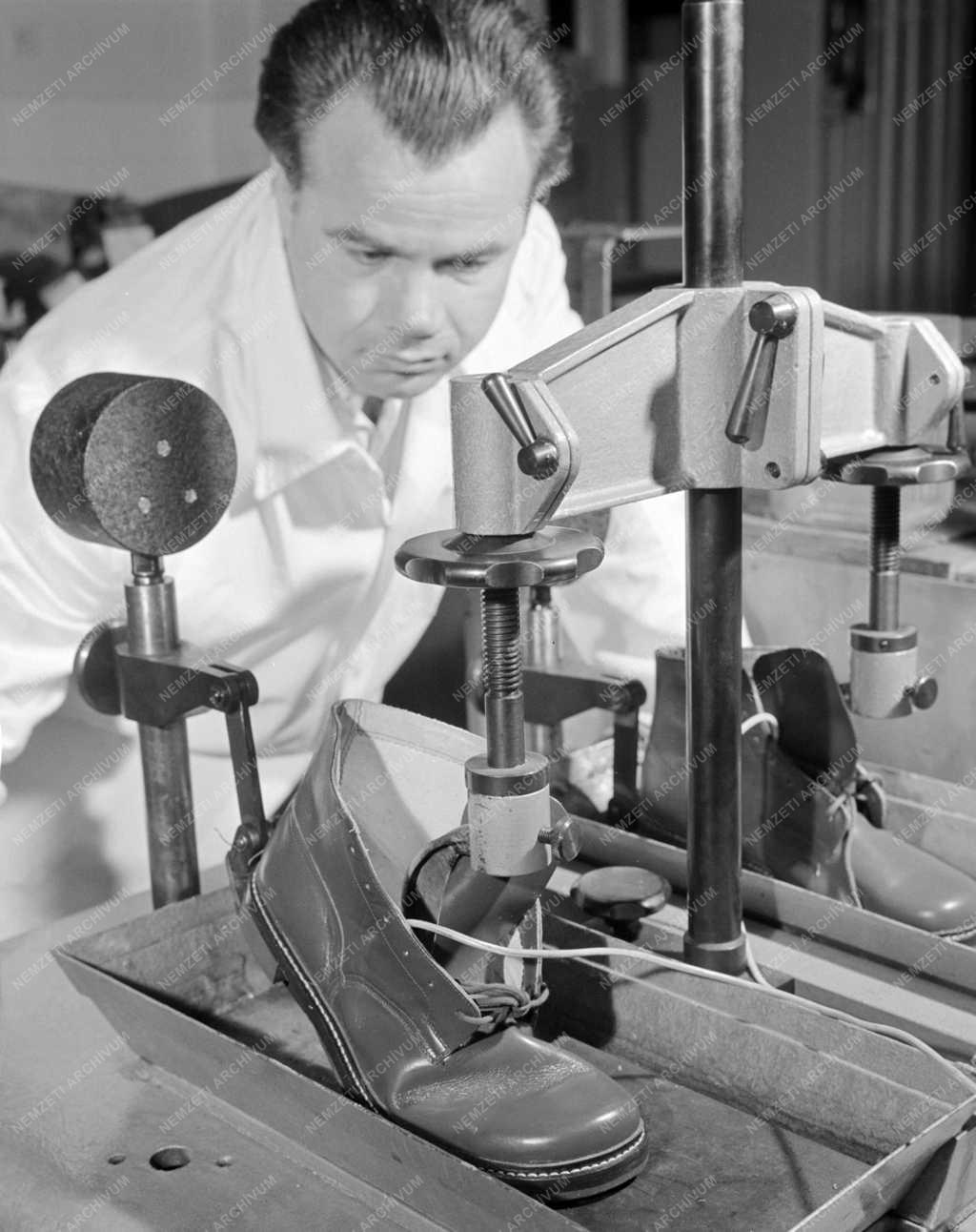 Reszkető Péter technikus a vizsgálatra beküldött új gyártmányú fiúcipő hajlékonyságát és vízállóságát vizsgálja a Bőr és Cipőipari Kutató Intézet minőségellenőrző osztályán. Egy-egy ilyen vizsgálat során a gép tízezerszer hajlítja meg a cipőt, ami 7 km-es gyaloglásnak felel meg.