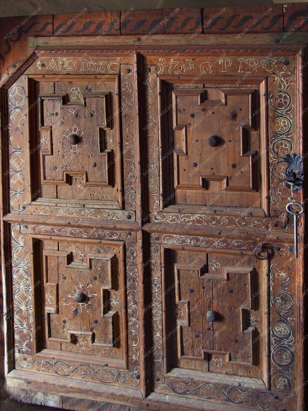 Díszes belső ajtó, tetején festett évszámmal a XIII. század végén, későromán-koragótikus stílusban épült berhidai római katolikus műemlék templomban.