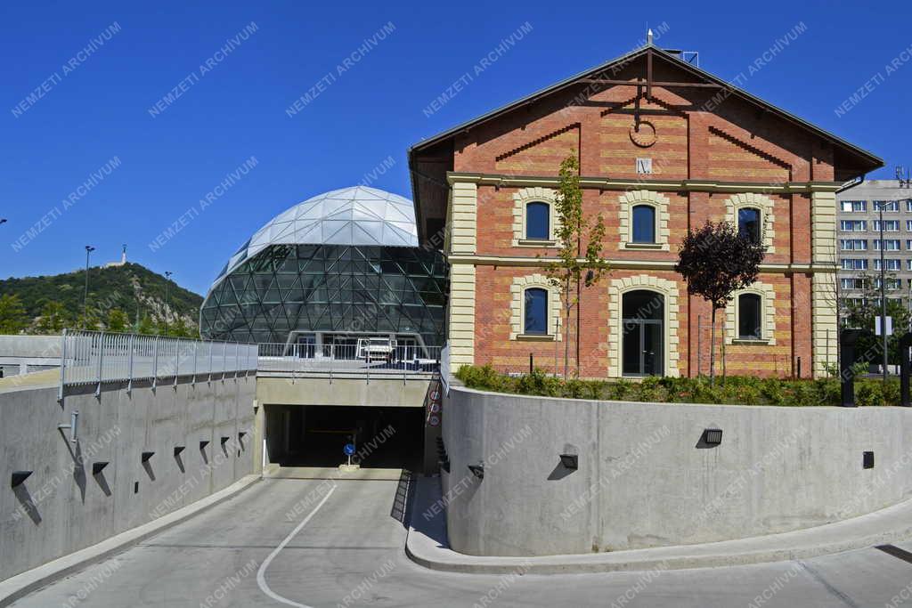 A Bálna kereskedelmi, kulturális, szórakoztató és vendéglátó centrum mélygarázsának bejárata. A beruházás az egykori közraktárak meglévő épületeit is hasznosítva épült fel a ferencvárosi Duna-parton.