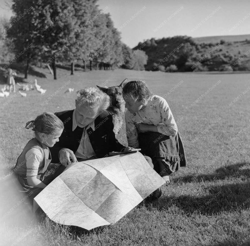 Kriván Pál geológus, a nyersanyagbázis felmérését végző kutatócsapat tagja pihenés közben műszereiket és térképeiket mutatja az iskolás gyerekeknek a bánki bányaüzem területén. A második 5 éves tervben kb. tízszeresére fejlesztik a bánya termelését. Az ásványi nyersanyagbázis kiszélesítésére és a rejtett nyersanyag feltárására végzett munka előkészíti, hogy Sztálinváros, Ózd és Diósgyőr minél több tűzálló agyagot kaphasson megfelelő kohóbélésre.