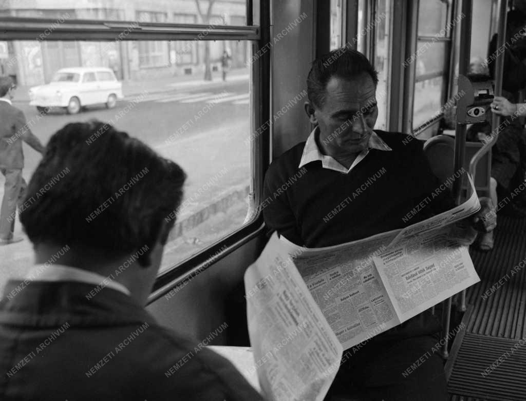 Férfiak olvassák az Esti Hírlap című napilapot a villamoson.