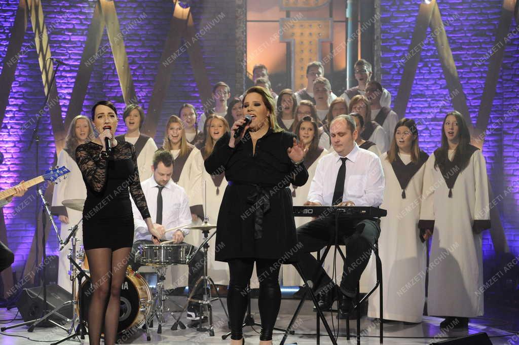 Tóth Vera (j) és testvére, Tóth Gabi énekesek a miskolci Fráter gospel kórussal közös dalt adnak elő a DTK - D. Tóth Kriszta Show TV-felvételén, az MTVA 1-es stúdiójában.