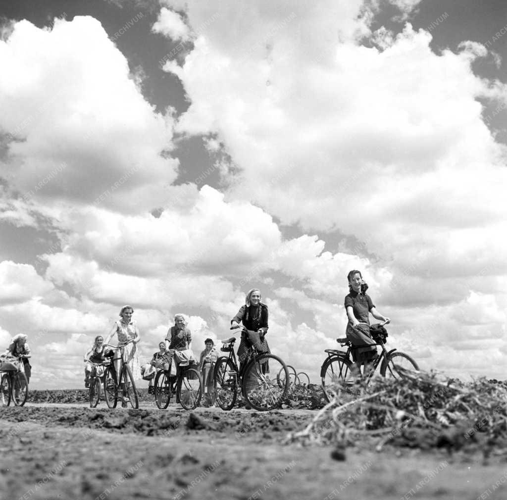 Hazafelé indulnak kerékpáron a lányok és asszonyok munka után a földesi Rákóczi tsz-ből.