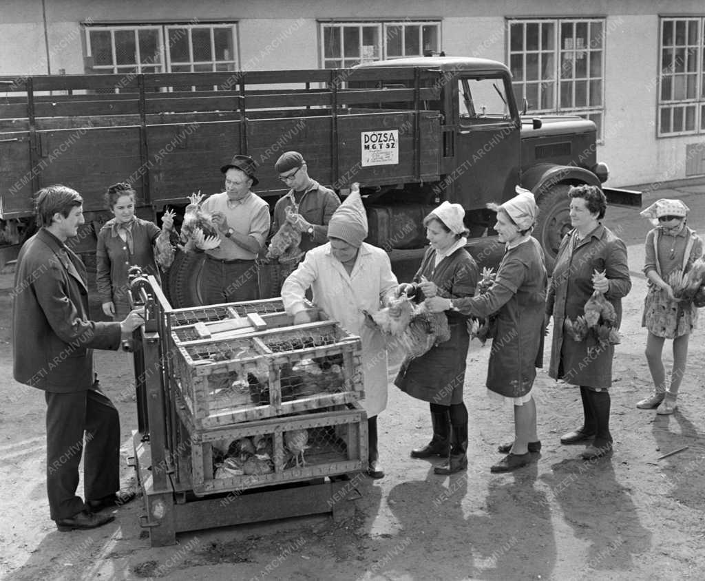 Bognár György, a baromfitelep vezetője mérlegen ellenőrzi a ketrecekbe zárt csirkék súlyát. Nagy Balázsné, Kovács Mihályné, Vincze Ferencné és Hegedűs Istvánné (b-j) a mérlegnél, a háttérben a teherautónál Nagy Katalin, Dezső László (kalapban) és Dobóczi Péter a telep dolgozói, csirkékkel a kezükben várják a mérlegelést. A baromfitelepen tízezer pecsenyecsirkét neveltek a húsvéti ünnepekre, amiből Budapestre is szállítanak.