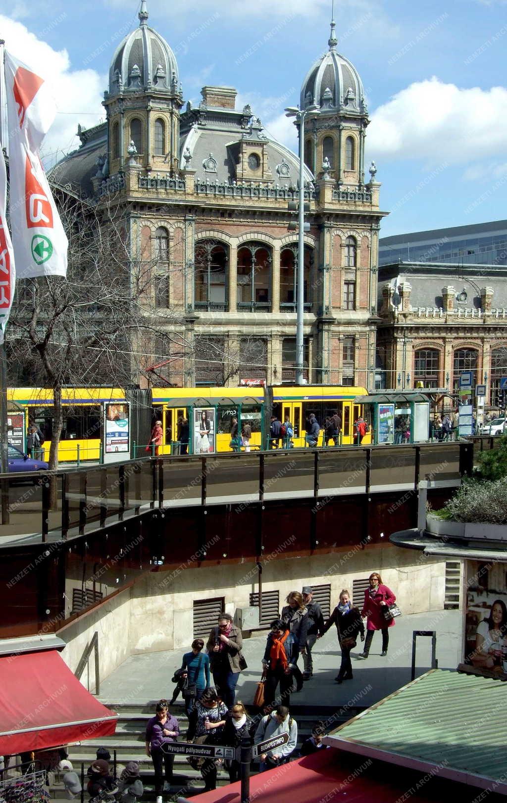 Gyalogosok mennek le a Nyugati téri aluljáróba, a háttérben a Nyugati pályaudvar épületének részlete egy Combino villamossal.