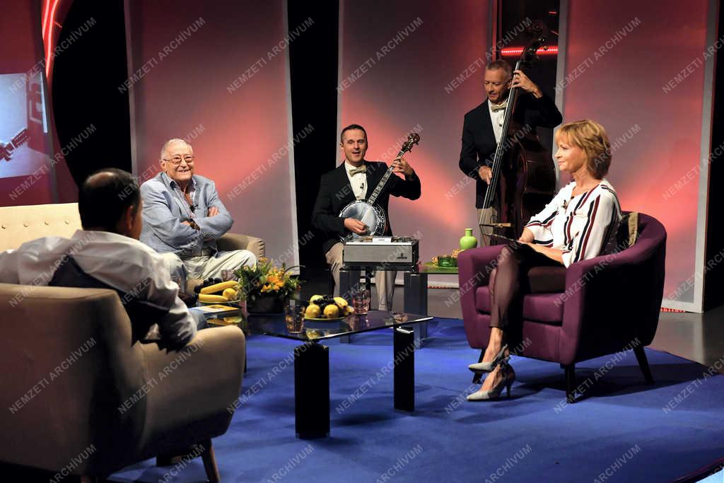Straub Dezső Jászai Mari-díjas színész, konferanszié (háttal), Kalmár Tibor Jászai Mari-díjas rendező, érdemes művész, Bényei Tamás Kossuth-díjas dzsesszzenész, a Hot Jazz Band együttes alapító tagja és vezetője, Juhász Zoltán bőgős (b-j), valamint Radványi Dorottya műsorvezető a Hogy volt?! című tv-műsor felvételén, az MTVA Kunigunda utcai gyártóbázisának 3-as stúdiójában. A műsorban a meghívott vendégek Forgács Gábor színész, humorista, szinkronszínész pályafutásának emlékezetes pillanatait idézik fel.