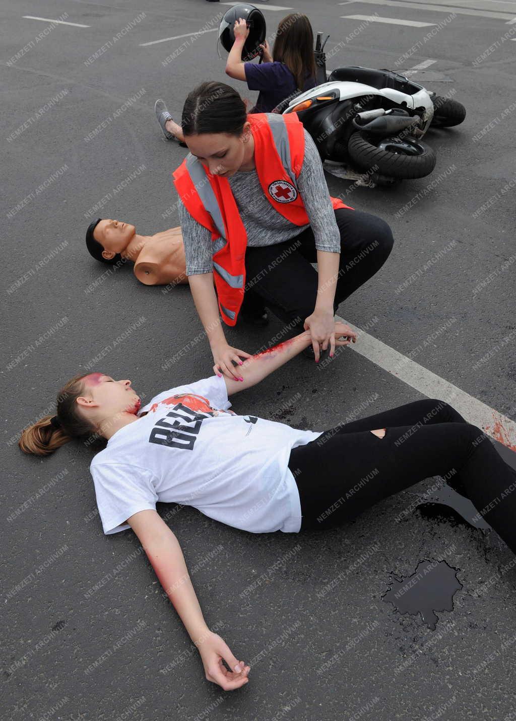 Készülnek a dublőrök a katasztrófa-szimulációs gyakorlathoz május 15-én a Thomas Mann és a Bolyai utca kereszteződésében. Itt rendezett ugyanis szimulációs gyakorlatot a Debreceni Egyetem Sürgősségi Orvostan Tanszéke, a Gyermekgyógyászati Intézet és az Országos Mentőszolgálat a rendőrök és a tűzoltók bevonásával. A szakemberek az együttműködést egy képzelt személyautó, motorkerékpáros baleset megrendezett és roncsokkal berendezett helyszínén gyakorolhatták.