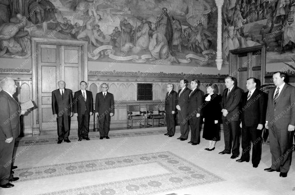 A Grósz-kormány új tagjainak eskütétele az Országház Nándorfehérvári-termében Németh Károly (b), az Elnöki Tanács elnöke előtt: (b-j) Kádár János, az MSZMP főtitkára, Grósz Károly, a Minisztertanács elnöke, Kállai Gyula, a Hazafias Népfront elnöke, Marjai József miniszterelnök-helyettes, kereskedelmi miniszter, Medgyessy Péter miniszterelnök-helyettes, Berecz Frigyes ipari-, Csehák Judit szociális és egészségügyi miniszter, Hoós János , az Országos Tervhivatal elnöke, dr. Horváth István belügy-, és Maróthy László környezetvédelmi és vízgazdálkodási miniszter.