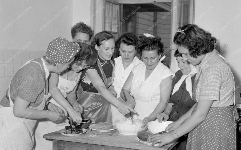 Farkas Józsefné tanárnő (b4) a torta készítését tanítja a Pedagógusok Szakszervezetének tagjainak a főzőtanfolyamon a szakszervezet Gorkij-fasori székházában.
