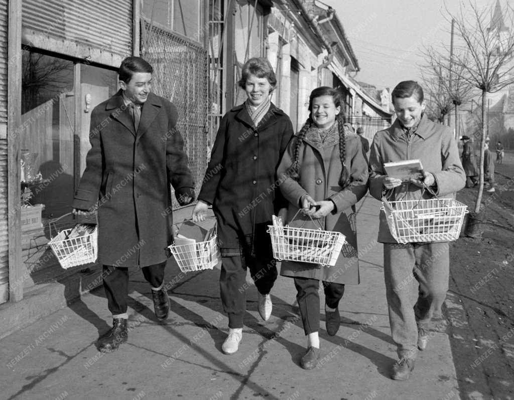 Az úttörők kosaraikban az újonnan megjelent könyvekkel indulnak a könyvesboltból, hogy társadalmi munkában, házról-házra járva segítsék a helyi könyvterjesztést.