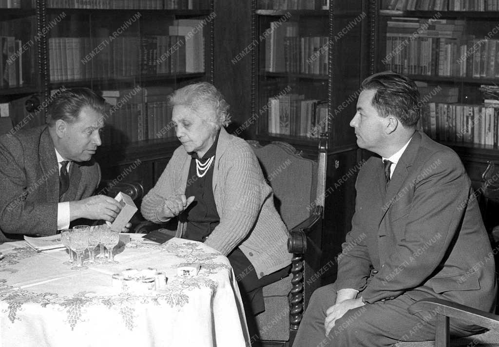 Kun Béla kommunista politikus özvegye átveszi Georgij Apollinarjevics Gyenyiszovtól (b), a Szovjetunió budapesti nagykövetétől a férje Vörös Zászló Érdemrend kitüntetéséről szóló dokumentum másolatát. Kun Bélát 1927-ben tüntette ki a Szovjetunió Legfelsőbb Tanácsa. Jobbra Puja Frigyes, a Magyar Szocialista Munkáspárt Központi Bizottsága külügyi osztályának vezetője.