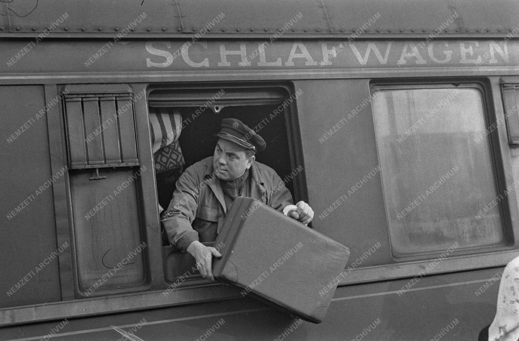 A hálókocsi ablakán keresztül adja ki az utas poggyászát – bőröndjét – a vasúti hordár, miután megérkezett az állomásra az Arlberg Expressz, amley Hegyeshalomtól Lökösházáig közlekedik.