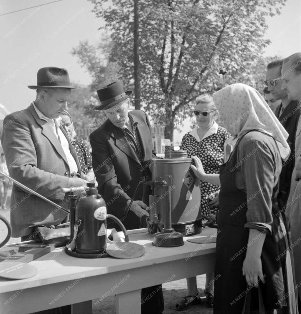 Varga János, a Bányászati Mélyépítő Vállalat dolgozója és Károlyi Imre örkényi egyéni gazda az NDK-gyártmányú (Német Demokratikus Köztársaság) permetezőgépeket néznek az Országos Mezőgazdasági Kiállításon.
