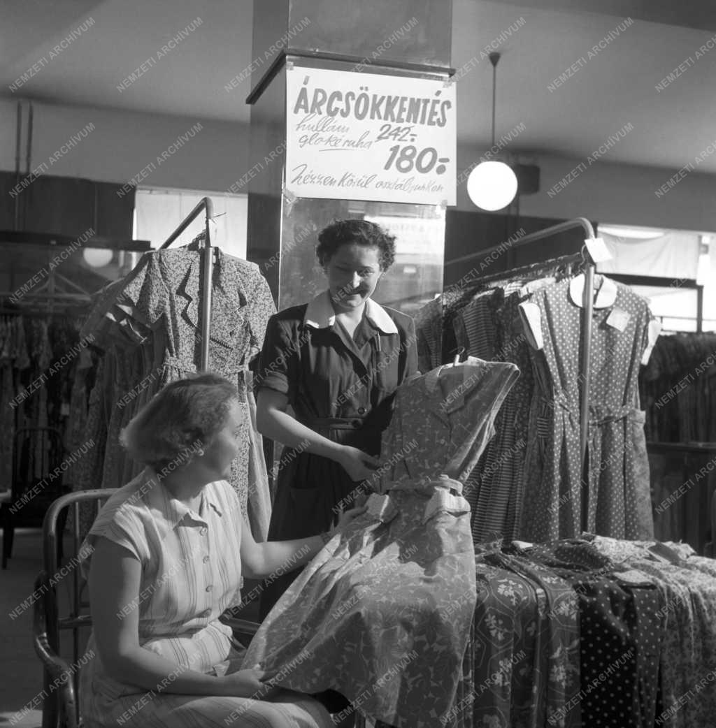A Magyar Divatcsarnok dolgozói egy árcsökkentett hullám gloké ruhát nézegetnek.