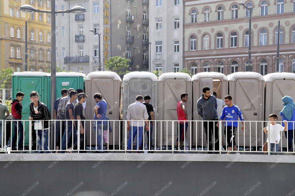 Illegális bevándorlók a Baross téren felállított mobil WC-k előtt 2015. szeptember 3-án.