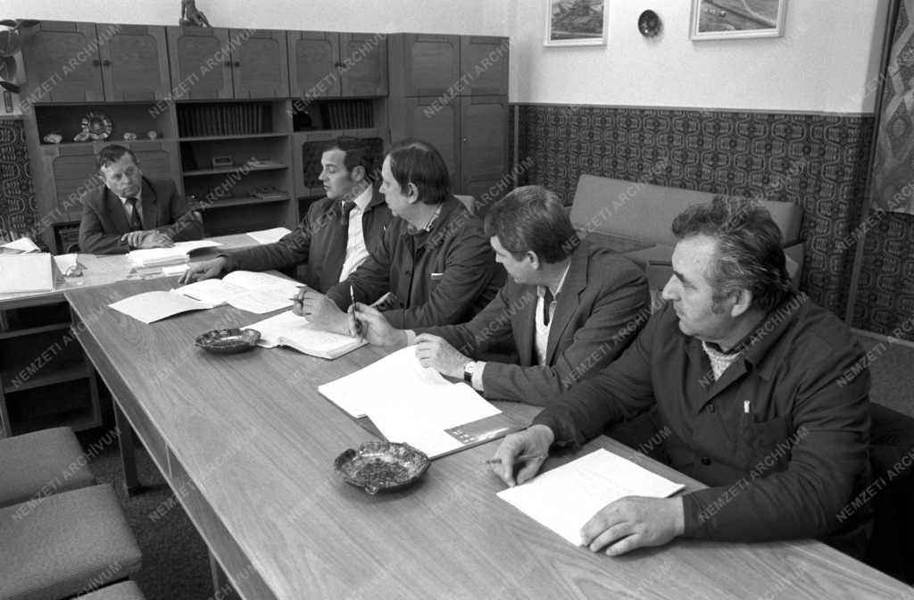 Kálomista Imre üzemigazgató (b) megbeszélést tart munkatársaival a Mátraaljai Szénbányák Thorez külfejtéses Bányaüzemében a rendkívüli hóhelyzet következtében adódó tennivalókról.