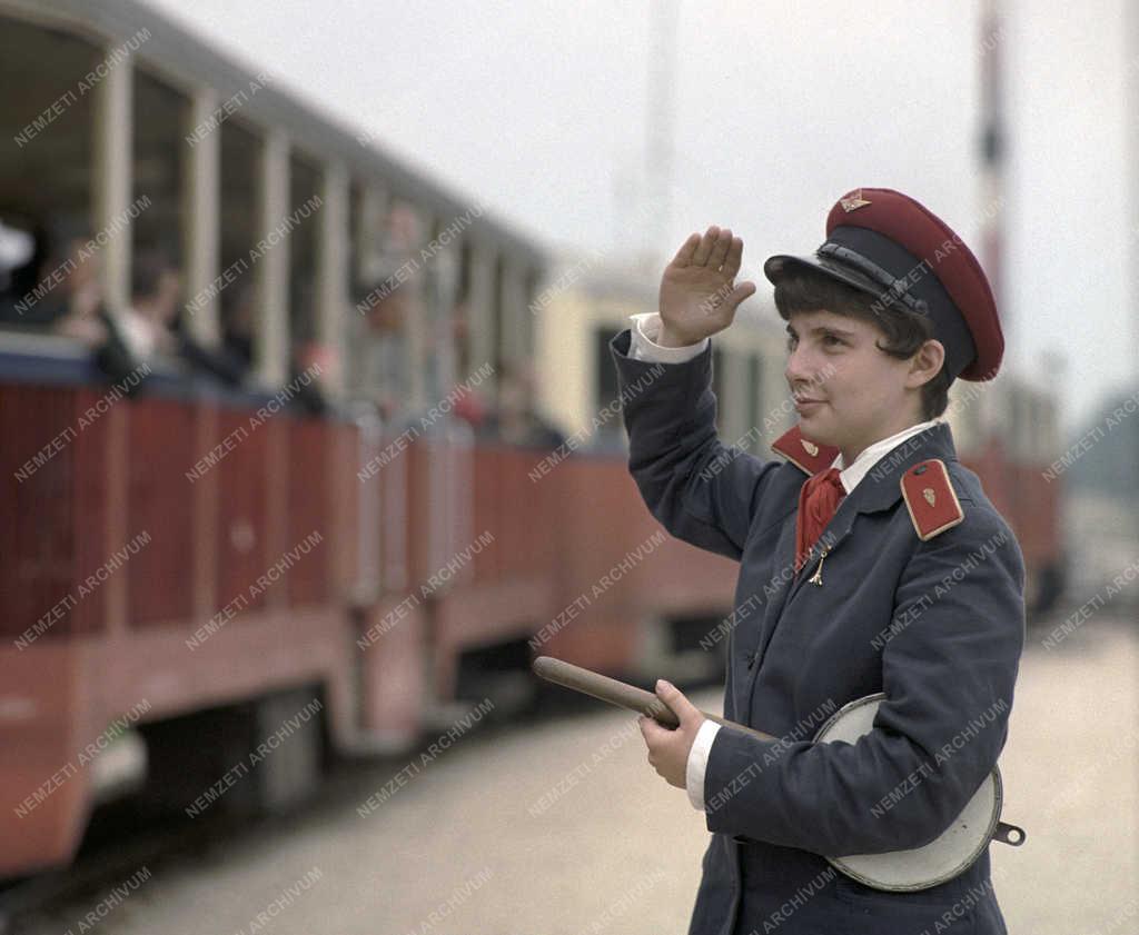 Úttörő naplózó forgalmi szolgálattevő tisztelegve meneszti a vonatot az Úttörővasút Széchenyi-hegyi végállomásáról.