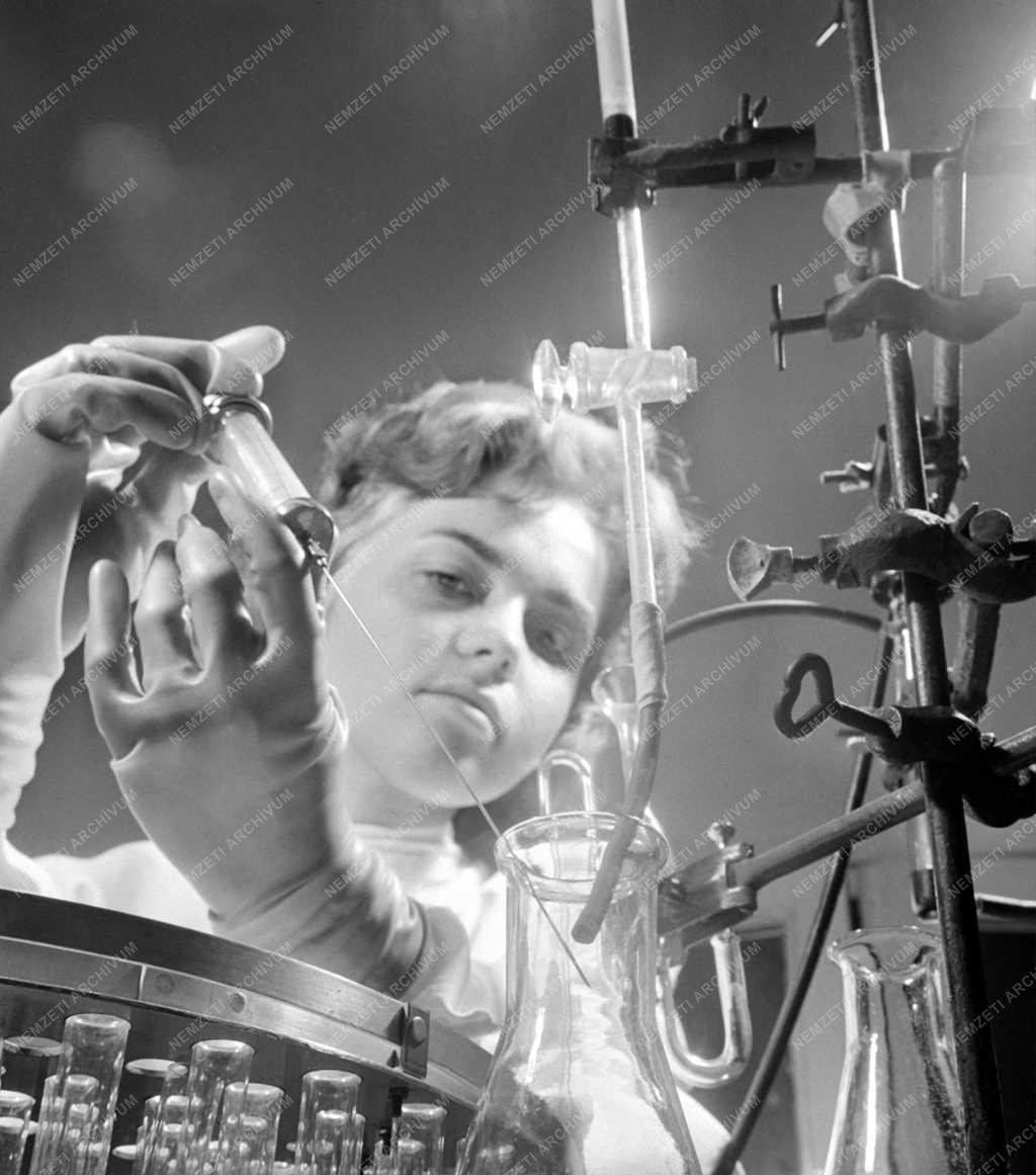 Holube Anna, a Budapesti Műszaki Egyetem mezőgazdasági kémiai technológiai tanszékének asszisztense egy izotópos, jelzett vegyület vizsgálatát végzi. Az egyetem és a Reanal Finomvegyszergyár kutatási szerződést kötött rádióaktív atomokkal jelzett vegyületek előállítására.
