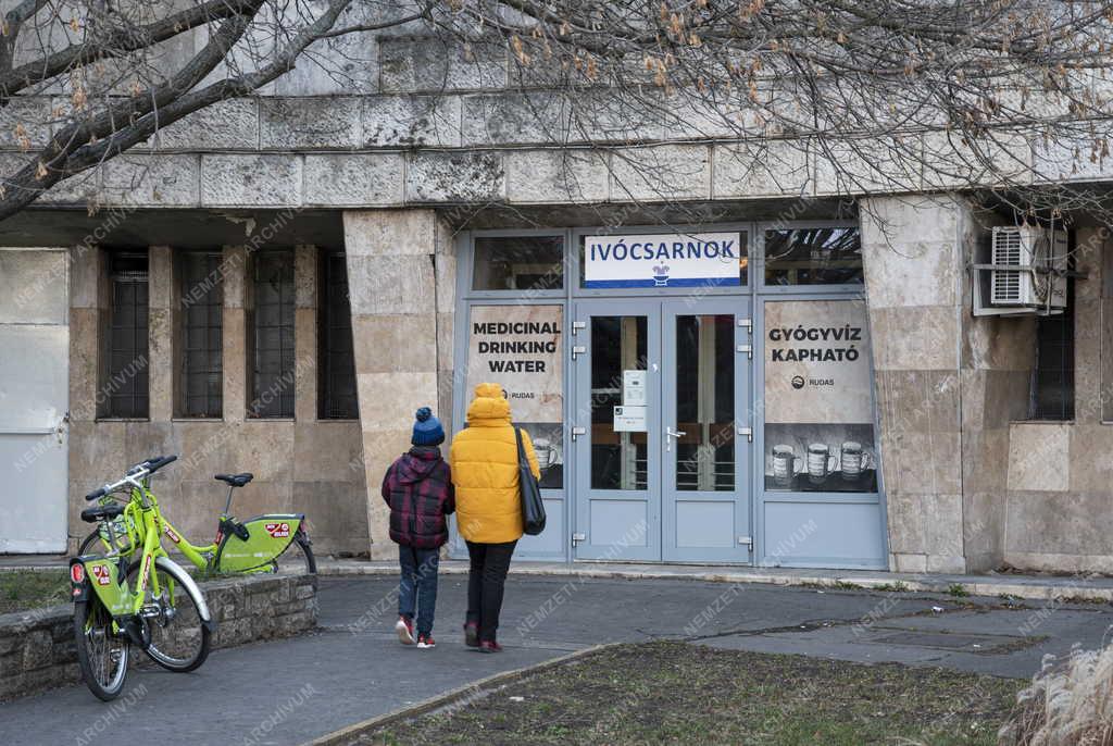 Érdeklődők haladnak a Rudas ivócsarnoka felé az Erzsébet híd budai hídfőjének lábánál. Itt háromféle gyógyforrás vize érhető el, a Juventus-, az Attila-, és a Hungária forrásoké, melyek különböző egészségügyi panaszok enyhítésére ajánlottak.