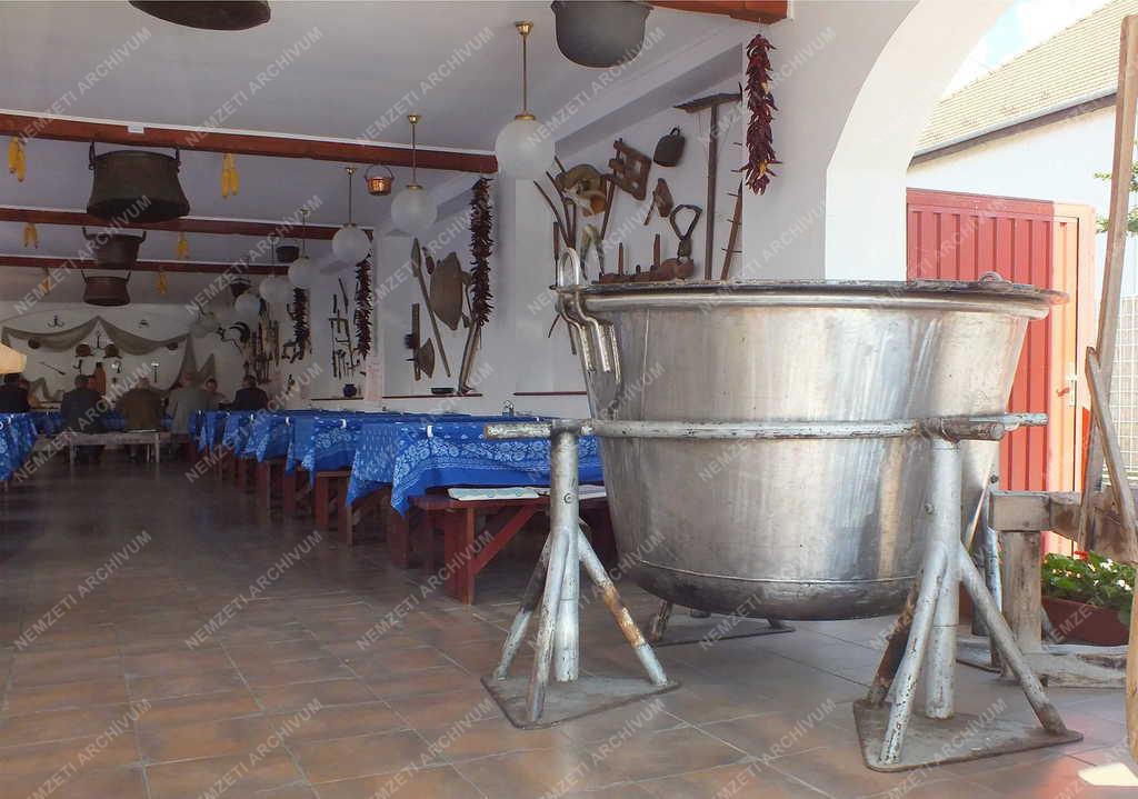 Szeged határában, a Fehértói Tájvédelmi Körzet több ezer hektáros halastavai mellet 1938 óta üzemelő, a halételeiről híres Fehértói Halászcsárda és Panzió éttermének részlete, az előtérben a halászcsárda egyik óriás bográcsa.