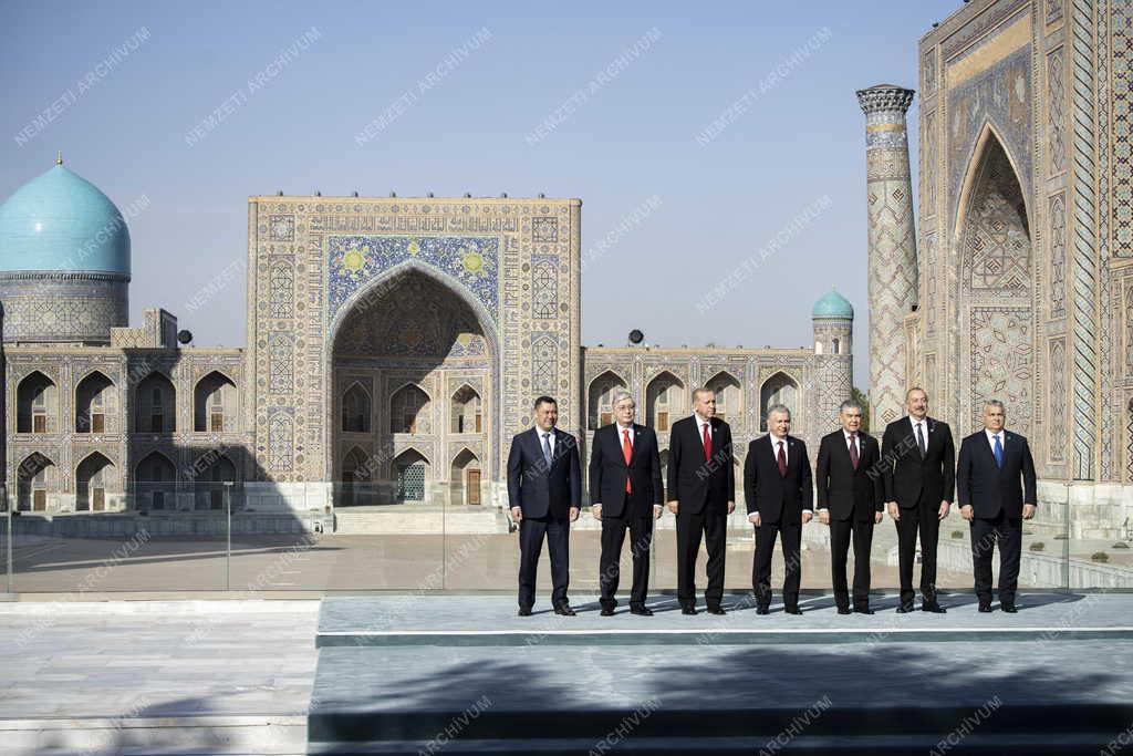 A Miniszterelnöki Sajtóiroda által közreadott képen Szadir Zsaparov kirgiz, Kaszim-Zsomart Tokajev kazah, Recep Tayyip Erdogan török, Savkat Mirzijojev üzbég elnök, Gurbanguly Berdimukhammedov volt türkmén elnök, a türkmén parlament felsőháza, a Népi Tanács elnöke, lham Alijev azeri elnök és Orbán Viktor miniszterelnök (b-j) a Türk Államok Szervezetének csúcstalálkozóján az üzbegisztáni Szamarkandban, a Regisztán téren 2022. november 11-én.