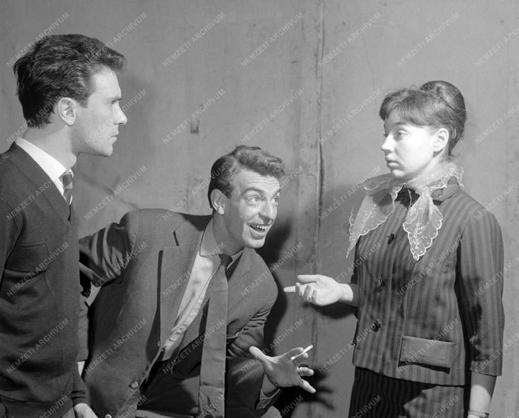 Tordy Géza - Gabi, ifj. Latabár Kálmán - Frici és Nádasi Myrtill - Lia (b-j), Gáspár Margit: "Hamletnek nincs igaza" című színművének próbáján a Vígszínházban.