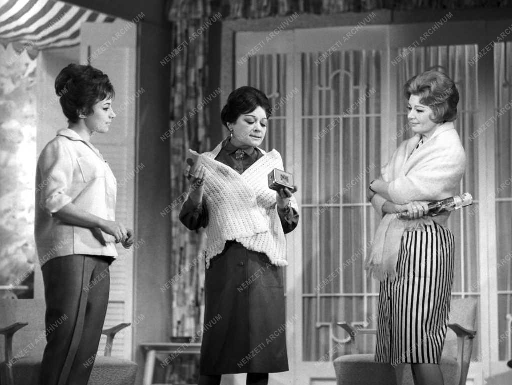 Csűrös Karola Emmi, Kiss Manyi Stefánia és Szemere Vera Paula (b-j) szerepében Gyárfás Miklós Változnak az idők című vígjátékának próbáján a Madách Színházban. A darabot 1963. január 4-én mutatják be Pártos Géza rendezésében.