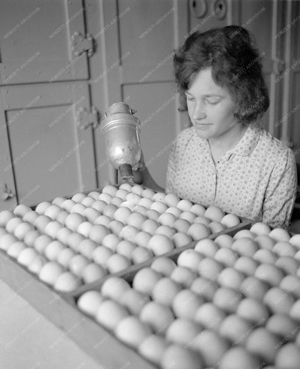 Egy mezőgazdasági szakmunkástanuló lány, a nyári szakmai gyakorlat keretében lámpával vizsgálja a tojásokat az egyik Pest megyei termelőszövetkezetben.