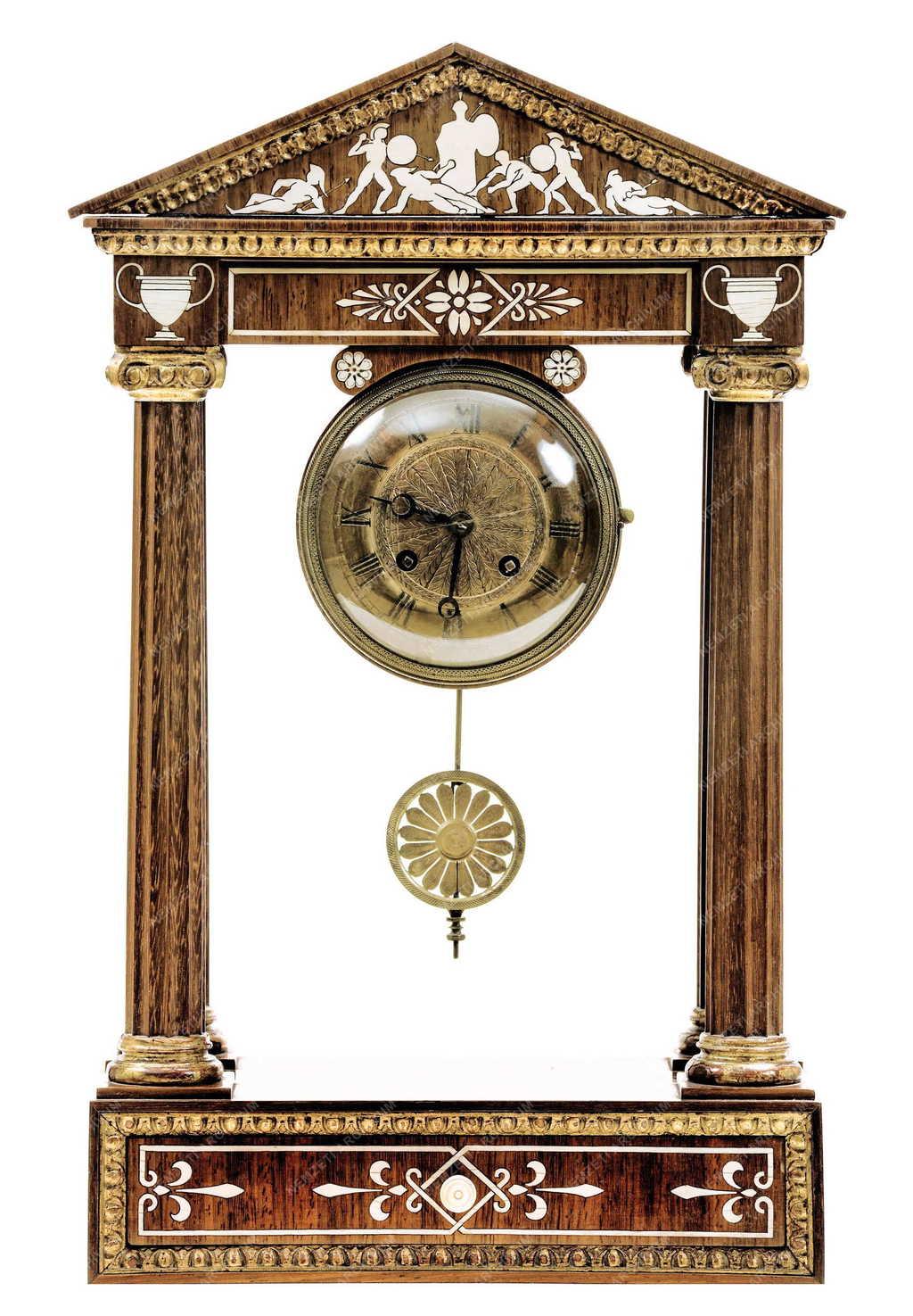 Favázas kandalló óra feles ütős szerkezettel, timpanonjában historizáló jelenettel.