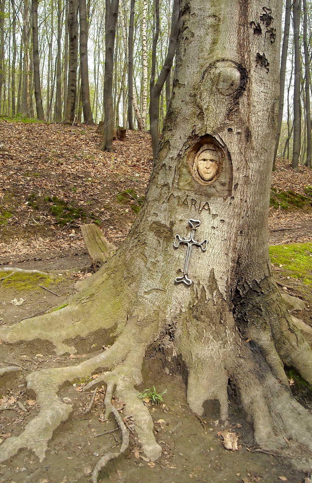Kereszttel és faragott arcképpel megjelölt, Szűz Máriának tisztelgő, öreg bükkfa a Vértes hegység Mária-szurdokának felső végén.