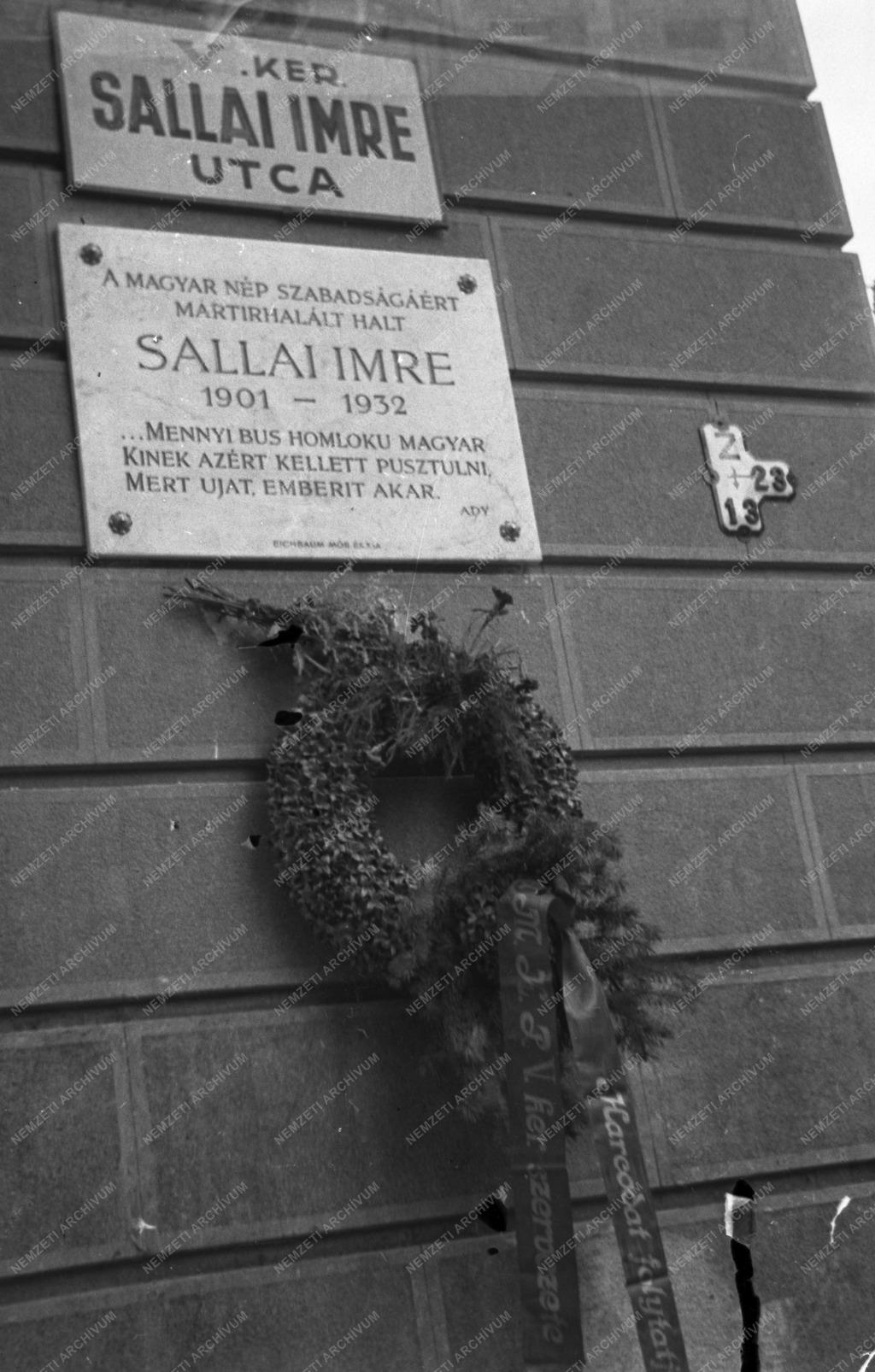 Sallai Imre emléktáblája, amelyet a róla elnevezett utca 1. számú házánál lepleztek le és koszorúztak meg ünnepélyes keretek között.