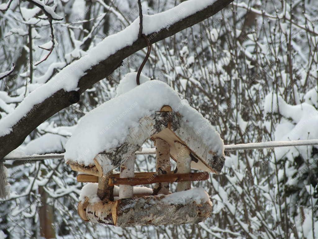 Fára függesztett madáretető a Napraforgó utca egyik havas kertjében.