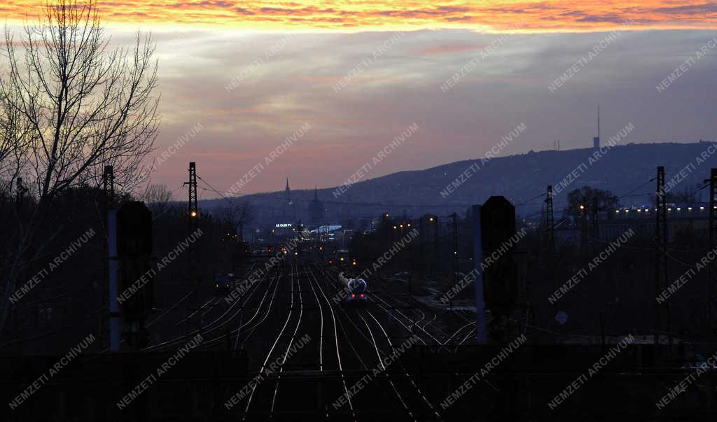 A Nyugati pályaudvar előtt lévő vágányok az alkonyatban.