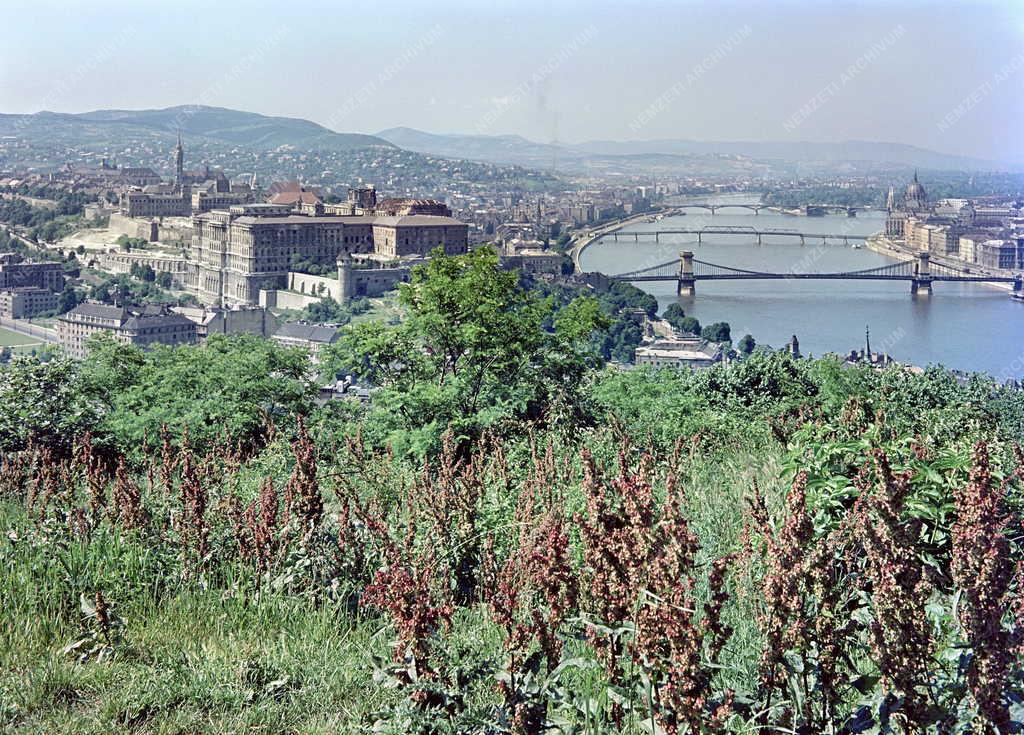 A főváros látképe a Gellért-hegyről. Balra a Budai vár, a háttérben a Duna, a Lánchíd, az Országház, az ideiglenes Kossuth-híd és a Margit-híd.