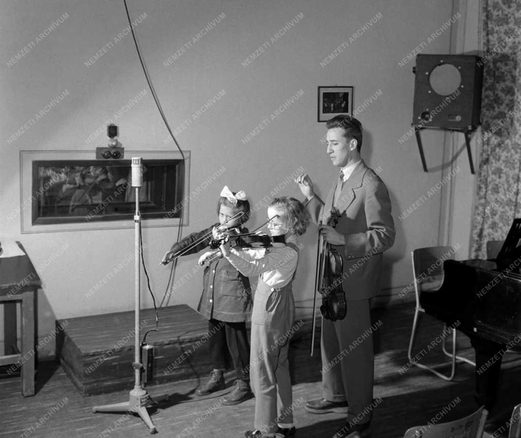 Csermák Mária és Horváth Katalin, a Mosonyi Mihály Állami Zeneiskola másodéves hegedűszakos növendékei Csukly Ödön tanár irányításával felvételt készítenek az iskola stúdiójában. A zeneszámokat magnetofonszalagra játsszák és visszahallgatáskor feljegyzik a hibákat, majd korrigálják azokat.