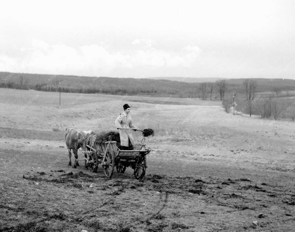 Kovács István fogatos trágyát terít a 212 holdas legelőre a zirc-aklipusztai Hajnal Termelőszövetkezetben.